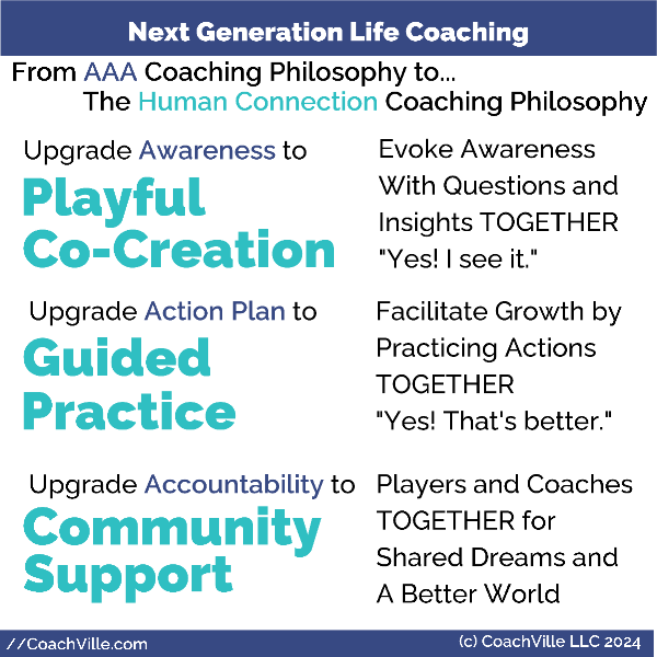 Learning these Concepts, SKILLS and Techniques will accelerate you into Professional Coaching or Transformational Leadership. You will be positioned to lead and enjoy an Egalitarian Coaching Culture that you co-create with the people around you; rather than struggling to maintain Hierarchical Control. (UGH)